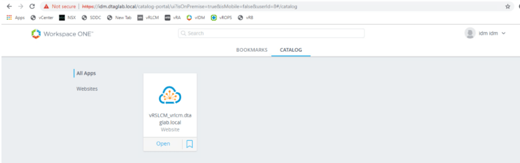 Notice that the header of the page has Workspace ONE logo and I see vRLCM application listed in the catalog.