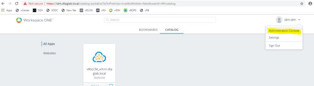 Let’s log in to vIDM using idm (local) account. We provided this account information while deploying vIDM.