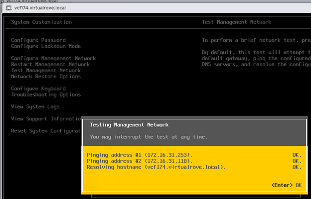 And finally, make sure that the ‘Test Management Network’ on DCUI shows OK for all tests.