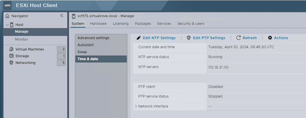 All ESXi must have ‘VM network’ and ‘Management network’ VLAN id 1631 configured. NTP server address configured on all ESXi.