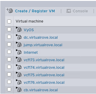 VyOS – This virtual router will act as a TOR for VCF env. dc.virtaulrove.local – This is a Domain Controller & DNS Server in the env. jumpbox.virtaulrove.local – To connect to the env. vcf173 to vcf176 – These will be the target ESXi’s for our VCF deployment. cb.virtaulrove.local – Cloud Builder VM to deploy VCF.