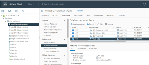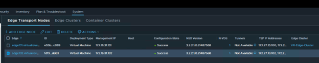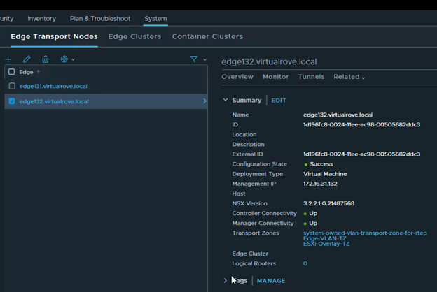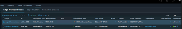 Note that the newly deployed edge (edge132) does not have TEP IP and Edge cluster associated with it. As I mentioned earlier, The new edge vm parameters should match with the existing edge parameters to be able to replace it.