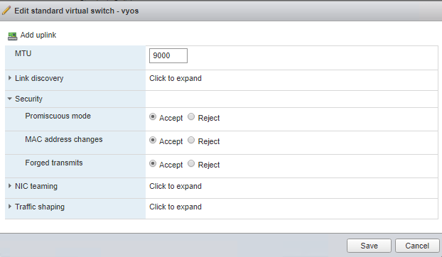 Promiscuous Mode – Accept MAC change – Accept Forged Transmits – Accept MTU can remain 1500 or can be changed as per your requirement.