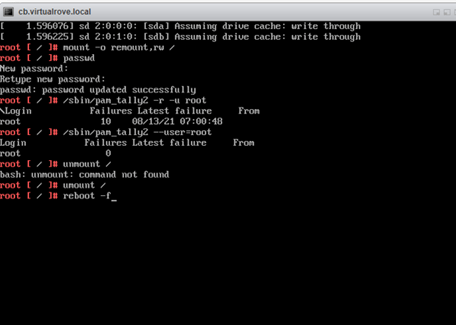 mount -o remount,rw / ::: To mount the root partition passwd ::: To enter new password, then re-type new password. /sbin/pam_tally2 –user=root –reset ::: To unlock the locked root account. Run this twice. umount / ::: To unmount the partition reboot -f ::: Reboot the VM